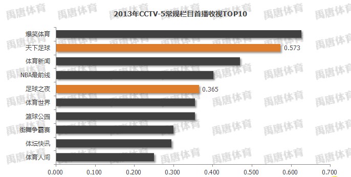 1、背靠强势资源,CCTV5两档足球节目收视均进入栏目收视前5,天下足球收视更高,位居第2位。