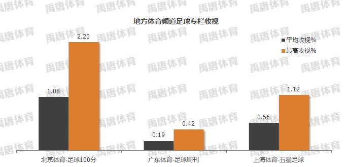 3、和赛事收视类似,地方体育频道中北京体育收视率最高,再度印证北京观众对足球运动的狂热。