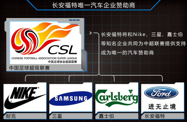 长安福特与中超联赛合作是首次引入汽车企业,其将与耐克、三星、嘉士伯等共同为中超联赛提供相关的支持,其中福特品牌LOGO将出现在中超联赛赛场以及球票上面,届时长安福特将在体育营销上有所突破,其品牌影响力也将得到很大提升,助其跻身国内第一阵营。
