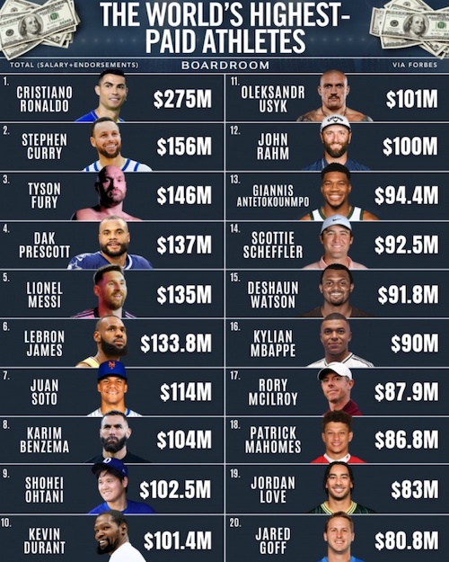 美媒BoardRoom转载了世界范围内收入(工资+代言)最高的运动员排名,这份榜单最早发布于今年5月。其中,C罗2.75亿美元断档领先,库里1.56亿第2,梅西1.35亿第5,詹姆斯1.338亿第6。另外,进入前20的NBA球员还有杜兰特(1.014亿第10)、字母哥(9440万第13)。进入前20的足球运动员还有姆巴佩(9000万第16)。
